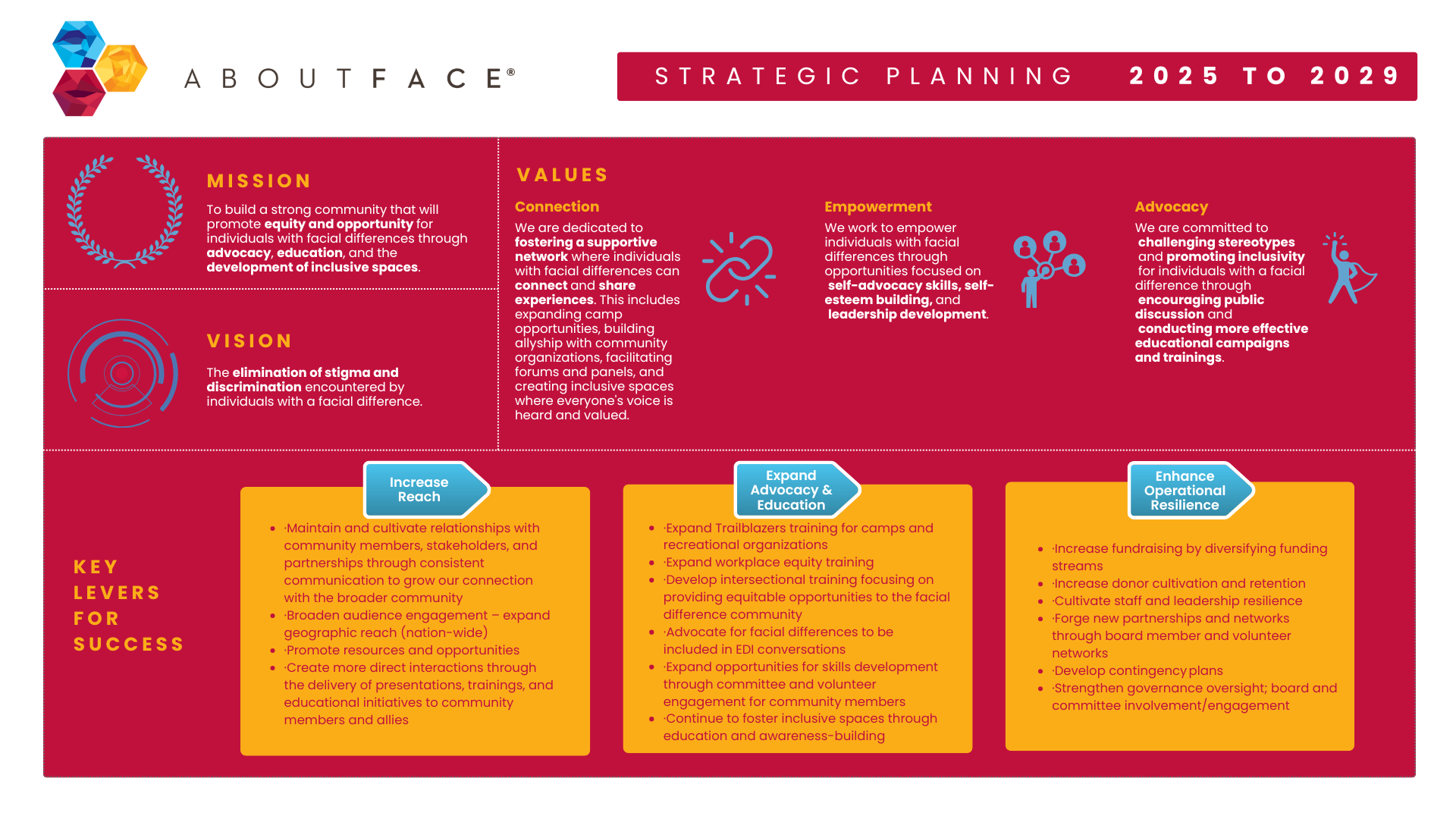 AboutFace has embarked on an exciting new path forward, strengthening the organization as we focus strongly on education and advocacy. Our 2025-2029 Strategic Plan outlines our core values and key levers for success, providing a clear roadmap for AboutFace to become a leading voice in advocacy for the facial difference community. With an emphasis on education, community collaboration, and resilience, we are shaping a brighter, transformative future.